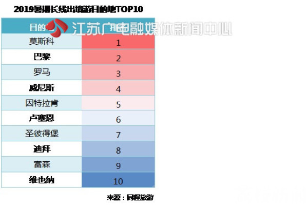 暑期長線出境遊熱門目的地前十名依次為:莫斯科、巴黎、羅馬、威尼斯、因特拉肯、盧塞恩、聖彼得堡、迪拜、富森、維也納,主要以歐洲目的地為主,其中尤以俄羅斯和瑞士相關目的地最受歡迎。