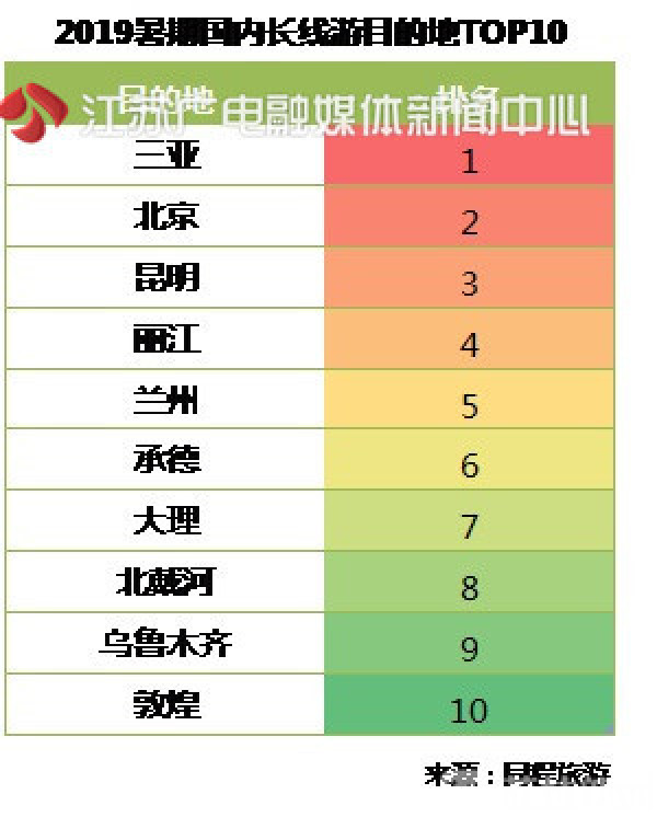 暑期國內長線遊熱門目的地前十名依次為:三亞、北京、昆明世界一姬神、麗江、蘭州、承德、大理、北戴河、烏魯木齊、敦煌。