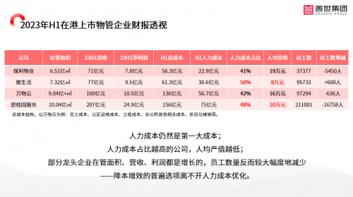 在善世服務大型地產物業的觀察與實踐中發現,上市物管企業的人力成本在總成本中的佔比通常為40%-60%,人力成本佔比越高的公司,人均產值越低,而部分龍頭企業在管面積、營收、利潤均增長的情況下,員工數量反而較大幅度地減少,如此看來,優化人力成本就是企業降本增效的重要選項之一。